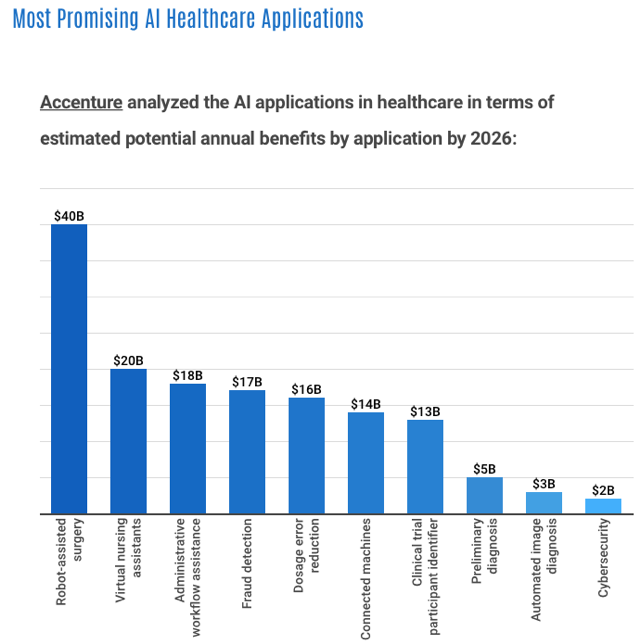 A report from the consulting firm Frost & Sullivan points out that AI healthcare market will experience a compound annual growth rate of 40% through 2021 to reach $6,6 billion.